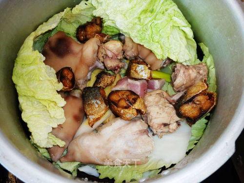 4. 炖煮:将炒好的肉类连同调料一起倒入高压锅中,加入足够的水,放入白菜、土豆、胡萝卜、香菇、木耳等蔬菜,盖上锅盖,大火烧开后转小火炖煮。